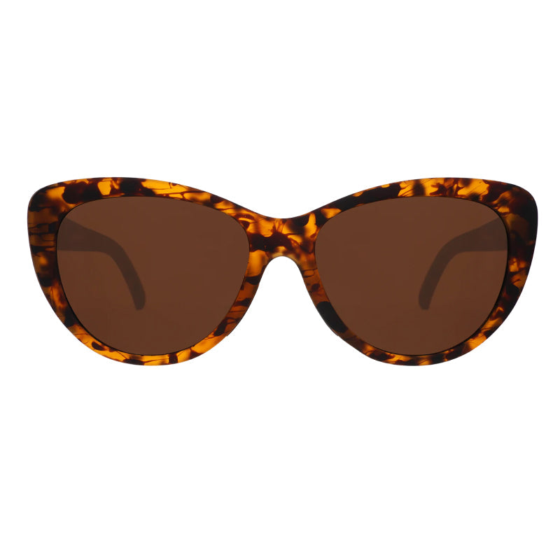 Experience fierce fashion with Goodr's The Catwalk's Meow sunglasses. Brown tortoiseshell frames, non-reflective lenses, and gold accents create a daring look. Perfect for anyone looking to make a statement and stand out from the crowd. Warning: may cause runway catfights due to extreme style envy.