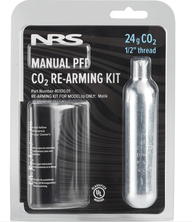 Re-arm the NRS Matik Inflatable PFDs with the 24g CO2 Re-Arming Kit. For extended trips, be sure to have a spare kit and prepare for the unexpected.