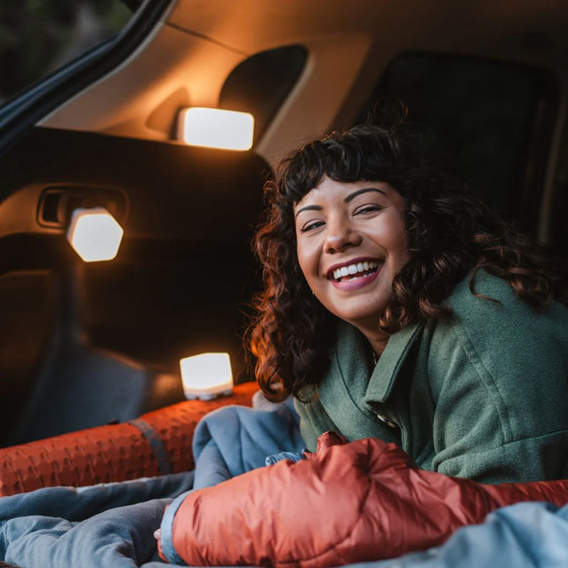 Each LED Cube and Rectangular Cuboid has its own power source and operates independently from the other lantern units. To turn ON: Press and hold power button for 3 seconds. Quickly press the power button 2 times to cycle between Cool White and Warm White mode. Toggle between brightness settings High, Medium, Low, and Candle Flicker by pressing the power button. To Turn OFF: Press and hold power button for 3 seconds. Each LED Cube and Rectangular Cuboid can be removed from the charging base. Once removed, each unit has an integrated clip to hook and hang as needed. Each unit is also equipped with a magnetic attachment point and can be attached magnetically. We do not recommend solar charging indoors or in a car, as windows will block the portions of light needed for solar charging. Do not leave your LuminAID on a car dashboard. A hot car can exceed the safe temperature range for this product.