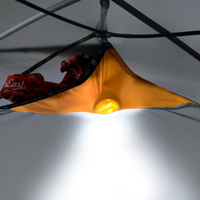 Les parois latérales verticales et les portes massives de l'Aurora permettent de s'asseoir confortablement côte à côte. Son arceau en aluminium léger comprend un moyeu forgé sur mesure, issu de la nouvelle collection d'accessoires Elements™ de NEMO. Des poches intérieures permettent de ranger ses effets personnels et de les garder à portée de main, tandis que les poches Nightlight Pockets™ au plafond diffusent la lumière des lampes frontales pour créer une douce lueur la nuit.