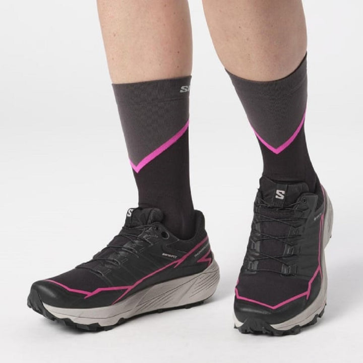 La chaussure Salomon Thundercross GTX pour femme offre une conception imperméable qui permet une foulée confortable et soutenue, avec une traction et une stabilité supérieures grâce à ses crampons agressifs de 5 mm. Développées et testées sur le terrain difficile des Alpes françaises, ces chaussures sont prêtes à relever tous les défis, des sentiers vallonnés aux pentes rocheuses et aux pistes simples glissantes.