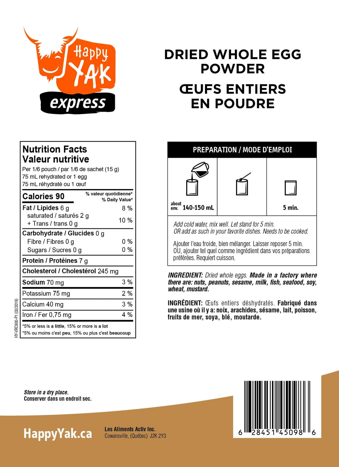 Optez pour le vrac ! Transporter des œufs lors d'expéditions, de camping ou d'autres activités de plein air n'est pas une prouesse évidente. La poudre d’œuf entier reste l’option parfaite pour vous faciliter la vie ! Utilisez-le pour faire une omelette, des œufs brouillés, des crêpes et des smoothies.
