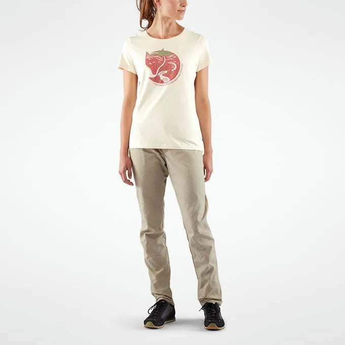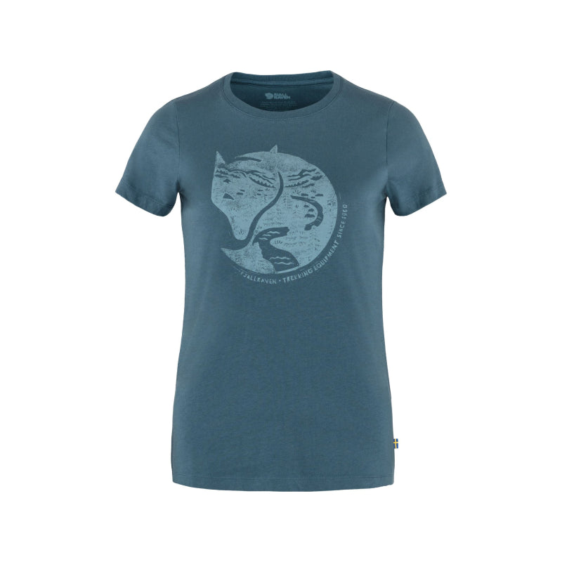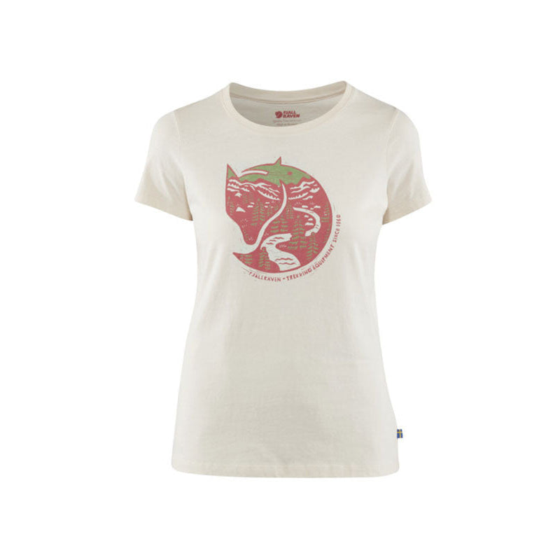 This organic cotton t-shirt features short sleeves and a round neckline. The front displays a print of the iconic arctic fox.