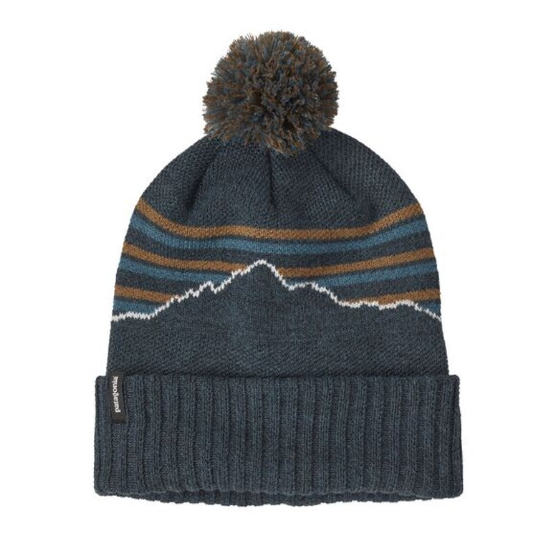 Knitted beanie with pom-pom and 'Patagonia' branding on a white background