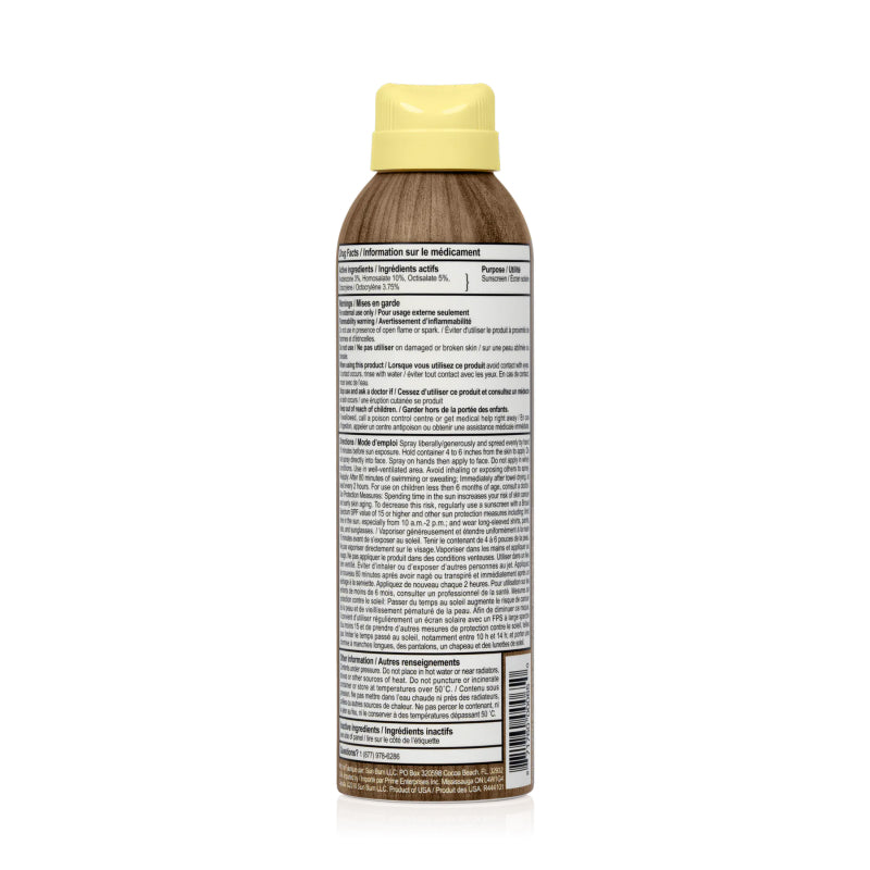 - Spray liberally and spread evenly by hand 15 minutes before sun exposure.